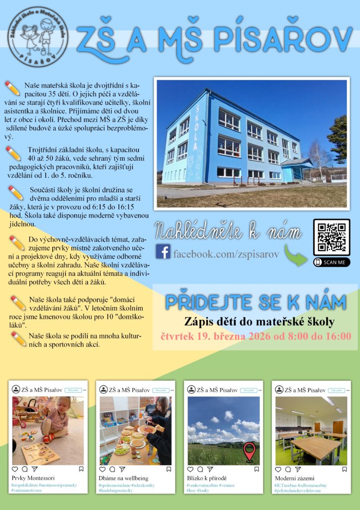 Zveme všechny děti a jejich rodiče k zápisu do naší krásné školky Veškeré informace o zápisu najdete na webu https://www.pisarov.cz/…/zs-a-ms…/zapis-do-ms-pisarov/ nebo vám je ochotně a s úsměvem sdělí naše paní učitelky přímo ve školce